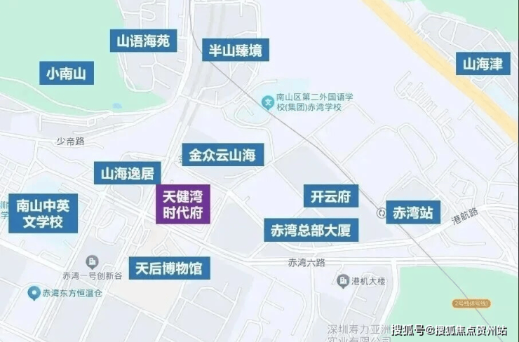 天健湾时代府位于招商街道赤湾片区赤湾六路与天后宫路交汇处以东,临近地铁2号线赤湾站。