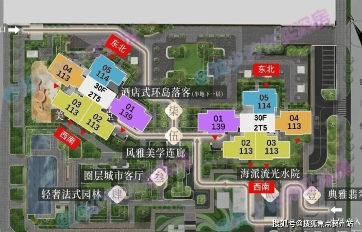 整体以朝南及西南为主,有两套114㎡朝东北面向金众。