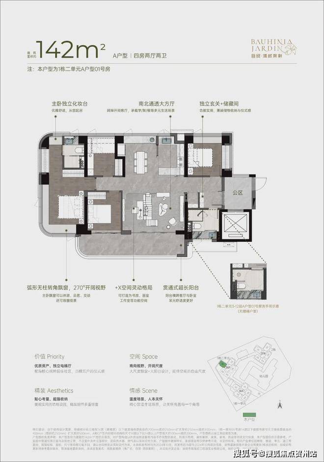 双龙抱珠户型,整个户型非常通透。书房分布于客厅另一侧,难得的双面采光+270°景观视野。主卧南北通透,景观面开阔。