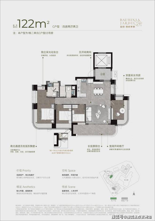 四房为主,多种厅式可选;大面积的飘窗利用,采光面大、实用率高;转角处使用弧形玻璃且都是无柱设计,景观视野佳;