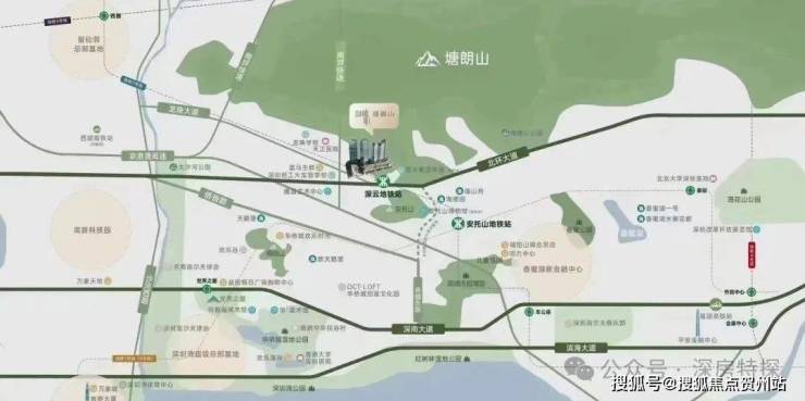 项目地址位于深圳市南山区桃源北环大道北侧塘朗山南麓,邻近深云地铁站。项目大体被山体包裹,西侧和南侧分别临近南坪快速路、北环大道两条城市快速路,其东侧还将建设侨城东路北沿线(规划中),所处片区相对割裂存在。