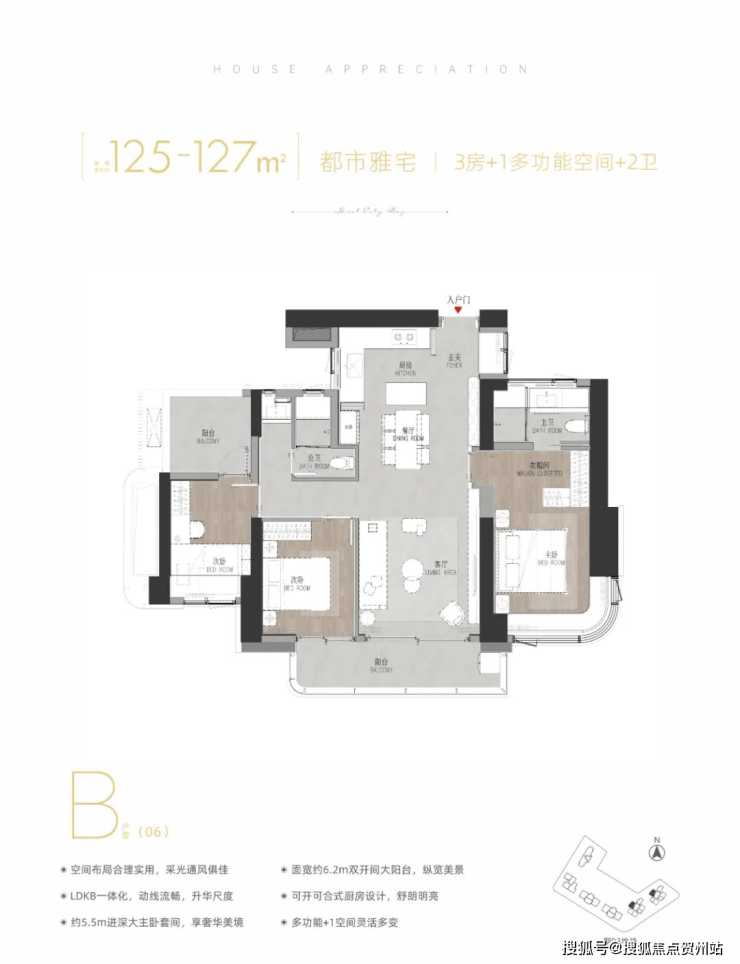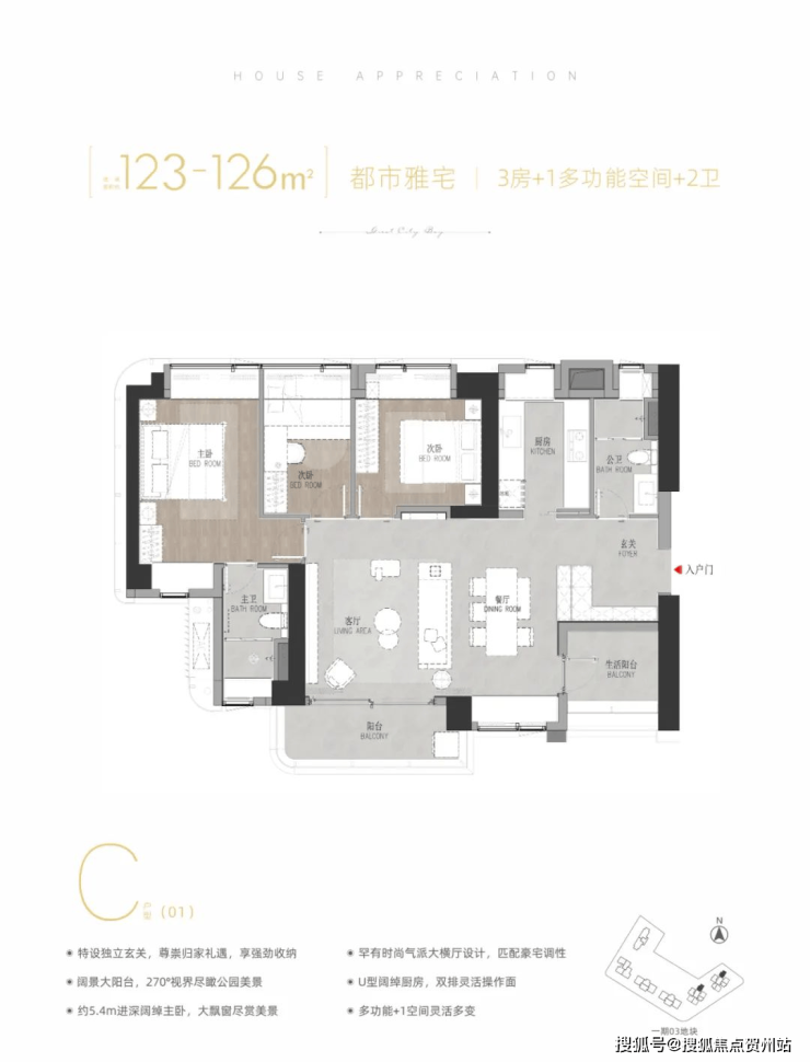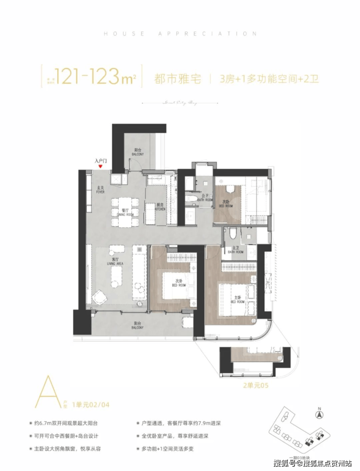 125㎡01户型3+1房,单价8.81-9.57万/㎡,总价1108-1191万