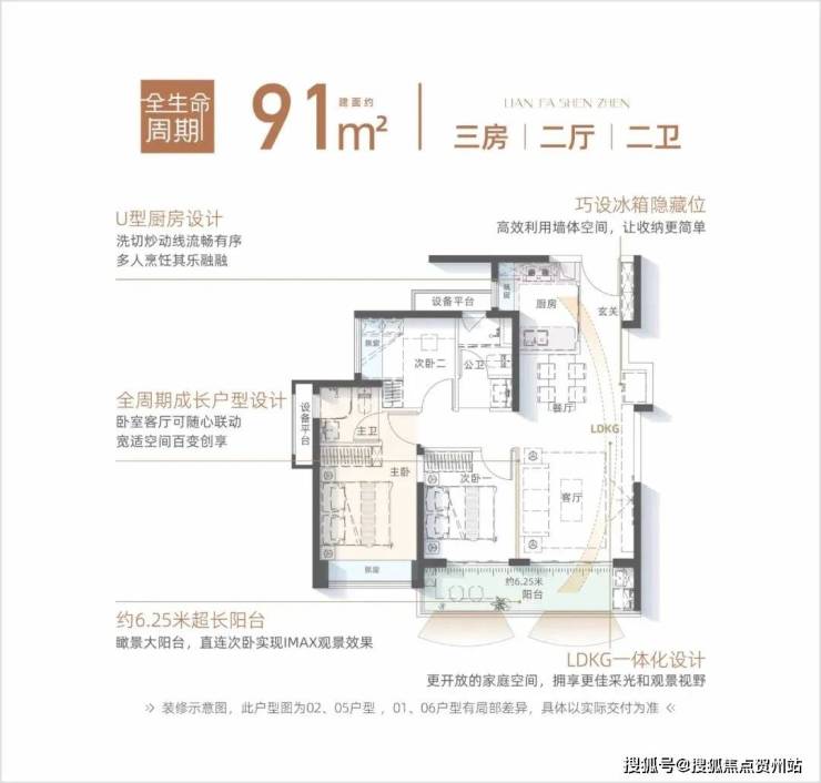 91㎡户型拥享约6.25米南向超长阳台,创变LDKG一体化设计,满足青年家庭成长需求。