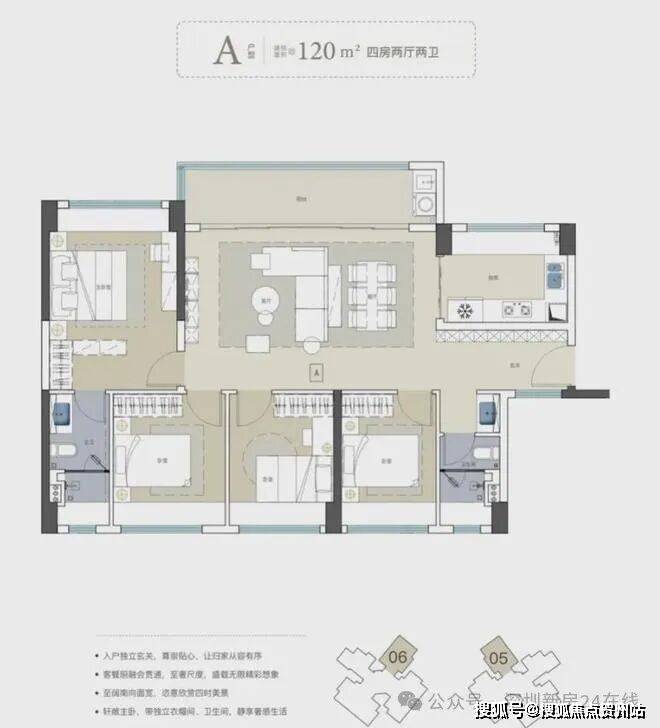 120㎡4房2卫户型,总价1080-1200万,本以为是南北通透户型,结果却是横厅设计。如此的收益点是拥有一个11.4米的超大阳台,观景视野辽阔,且没了竖厅必备的走廊,可利用空间进一步变大。