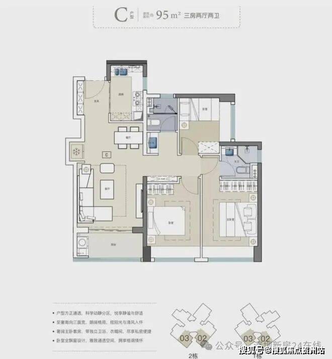 95㎡D户型三房,总价710-850万。唯一真正意义上的通透户型,客餐厅纵向分布,动静分离、干湿分离、通风性佳,缺点是其阳台在北侧,日照相对不足。值得注意的是,户型中私密性最好的主卧,同样也实现了南北通透,纵向双面开窗,大尺度观景,清风与鲜氧自由穿梭,居住品质大幅拔高。