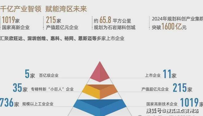 石岩科创城(规划面积65.8万平方公里)汇聚高端科技资源,驱动产业升级,形成产业集群效应,成为推动区域经济高质量发展的关键引擎。在2024年已汇集超过1019家国家高新技术企业,拥有215家产值超亿元企业,已汇聚欣旺达、深圳创维、惠科、裕同、恩斯迈等11家上市企业,规划科创产业集群突破1600亿元。