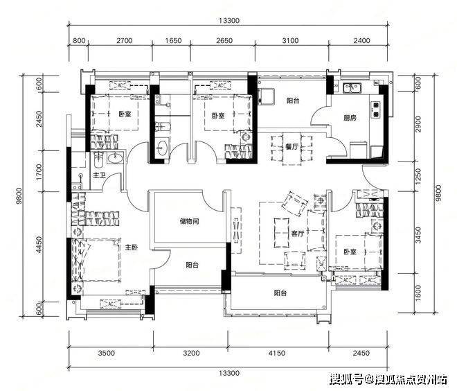 ✅ G01户型:约135㎡ 五房两厅两卫: