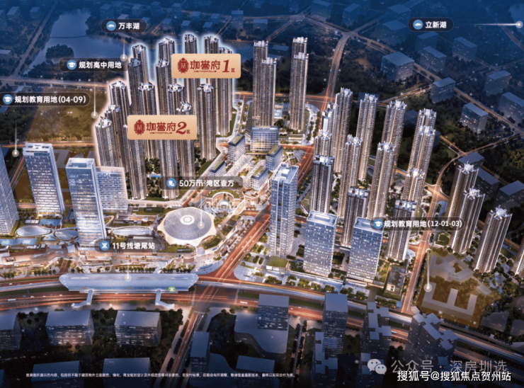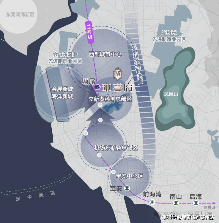 项目位于沙井新桥,珈誉府本身是一个大型综合体,自身配套丰富,自带50万㎡大型商业;地铁11号线塘尾站挨着项目,深圳外国语宝安学校在项目南北两侧,且靠近万丰湖、立新湖,有生态资源。