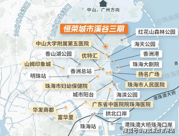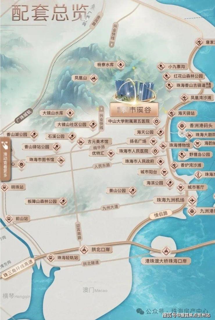 周边配套:约 800 米近情侣路,3 公里内有扬名广场、华润万家、香洲百货等商业体;医疗有中大五院,临近野狸岛公园、城市阳台、珠海大剧院等,生活娱乐配套成熟。