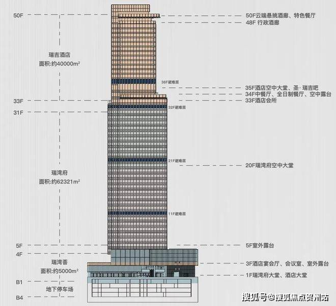 项目33-50F为瑞吉酒店,5-31F瑞湾府目前在售190-360㎡酒店式行政公馆,层高4.4米。