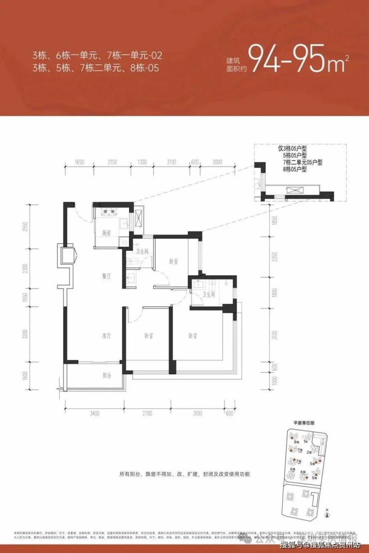 【约94㎡三房两卫户型分布:每一栋都有分布,也是主力户型,共1015套①户型分析:有横厅和竖厅两种户型;玄关、冰箱、储物/电视柜位置为凹槽设计,墙面平整美观;U型厨房,操作动线流畅;三开间朝南、卧室均带飘窗;超17㎡的开阔主卧,配合L型长飘窗,270°观景;三分离卫生间,干净舒适;②朝向:西南、东南向③视野:东南朝向的看社区花园社区泳池,西南向的看城市道路、施工建设