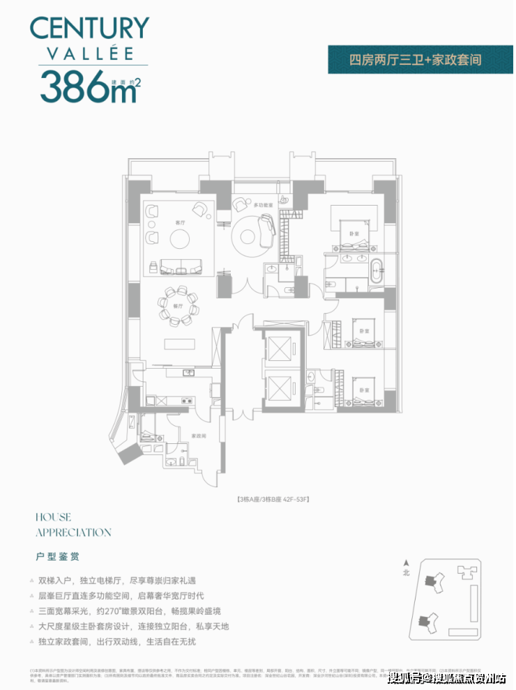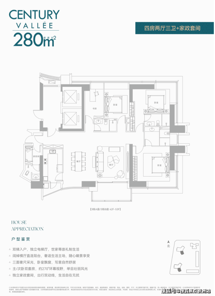约233㎡3+1房3卫 A户型,西北朝向看名商和沙河高尔夫;