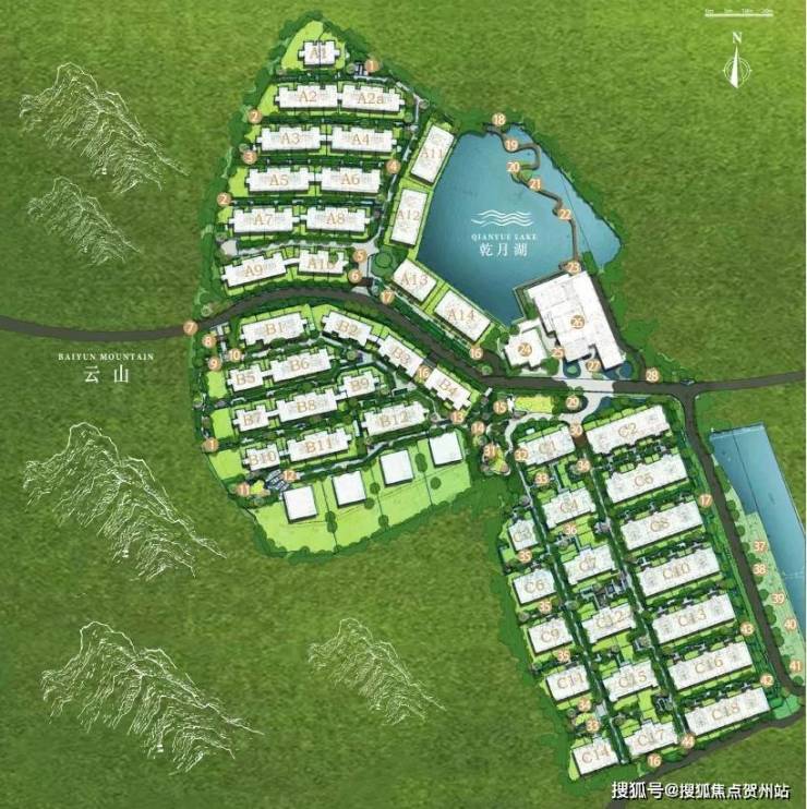 项目沿自然山脉地势而建,利用三面环山和地块落差的优势条件,采用“多台地”的布局,让每一栋视线不受遮挡,营造出背山靠湖的空间布局。