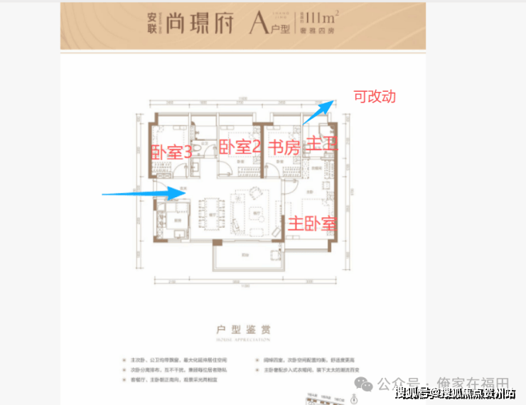 【户型111平米四房两卫南北通透户型】户型是四房两卫客厅是横厅朝南向,带阳台,主卧室带卫生间,且书房的位置可以改动主卧室带卫生间和书房,大三房两卫或者小四房两卫