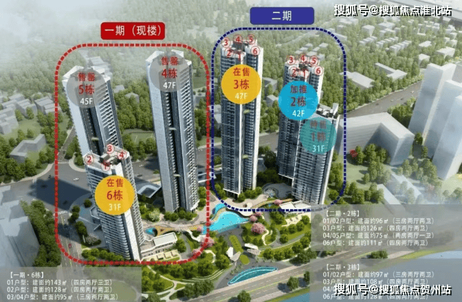 户型面积:二期户型建面约 75-128㎡,有两房两厅一卫、三房两厅两卫、四房两厅两卫等多种户型。