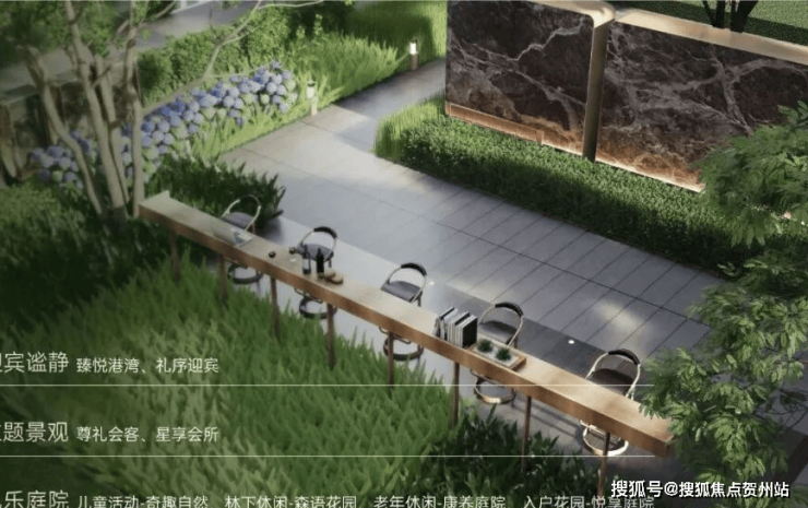 |“臻享森境”景观会客厅将自然之美与精致工艺融为一体,打造景观会客厅、艺术水景、户外吧台、阳光草坪等静谧空间。