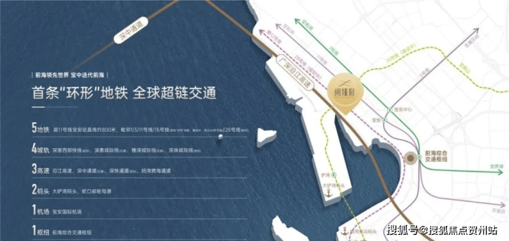 5地铁:直线距离约800米11号线宝安站,邻近地铁1/5/11号线/28号线(规划)/15号线首条“环形”地铁(建设中)4城轨:深港西部快线 (规划) 、深惠城际线(在建)、穗深城际线(在建)、深珠城际线(已规划)3高速:沿江高速、深中通道(在建)、深珠通道(规划)、妈湾跨海通道2码头:大铲湾码头、妈湾客运码头1机场:宝安国际机场1枢纽:前海综合交通枢纽