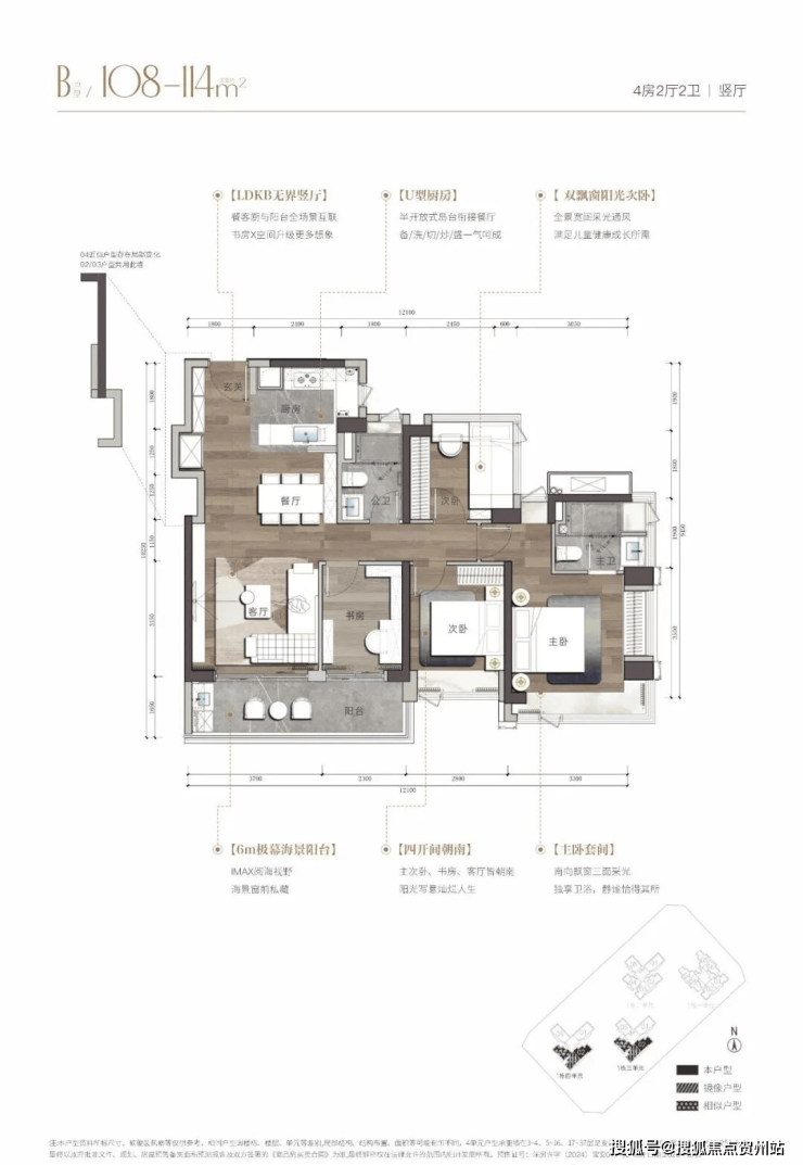 建面约108-143㎡海幕纯四房,臻藏级南向湾海视野,LDKB人性化动线设计,格局方正、高实用率,打造独立玄关、双飘窗主卧、步入式衣帽间等个性化空间。
