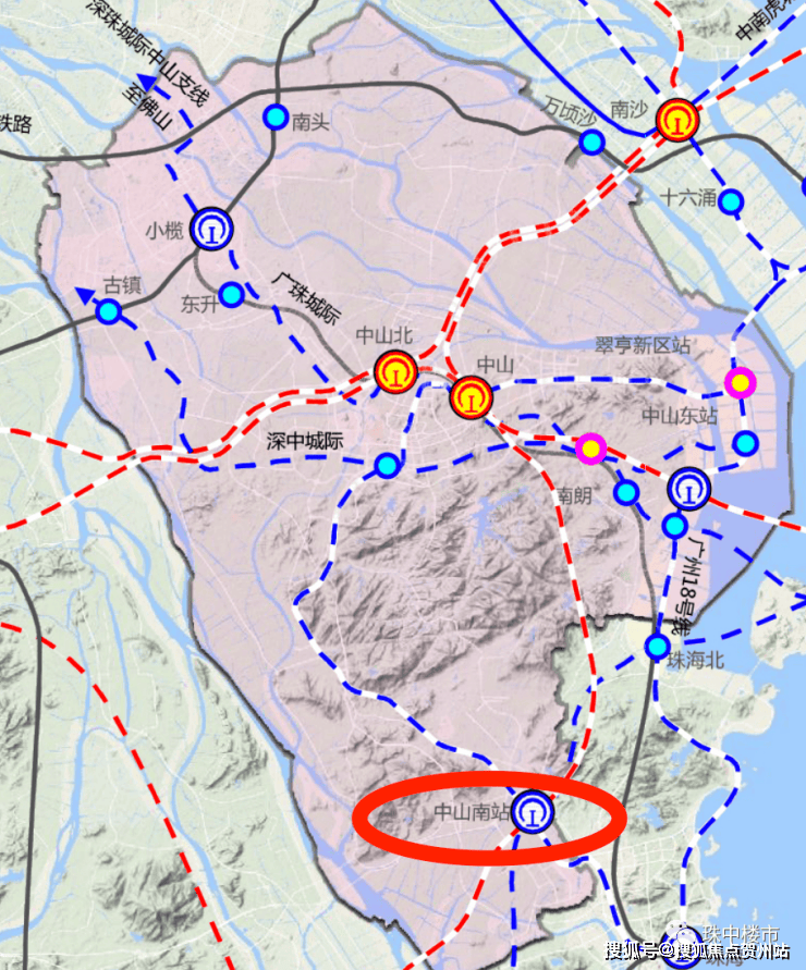 按照规划,中山南站将为广中珠澳高铁、深珠城际、以及广州地铁18号线途经提供站点,其作用对标珠海北站(《中山市综合交通规划(修编)》)。