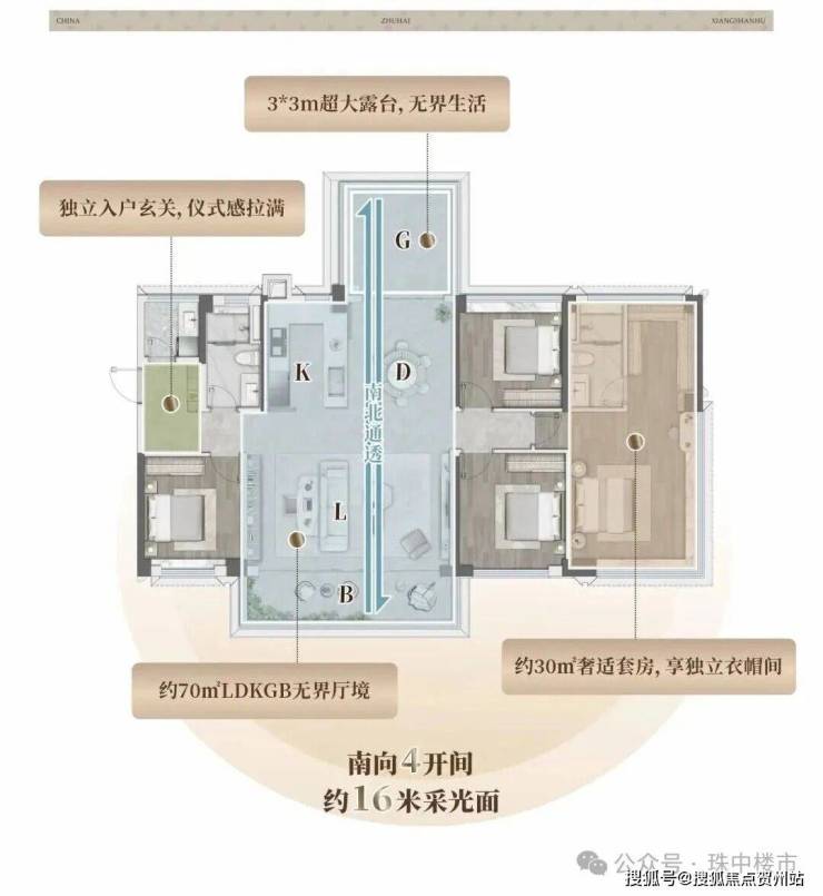建面约136㎡4房2厅2卫,更是实现南向四开间超16米大面宽,并通过南北通透的客、餐厅、景观阳台、露台构建出空气流通与光线穿透的开阔感。