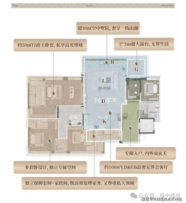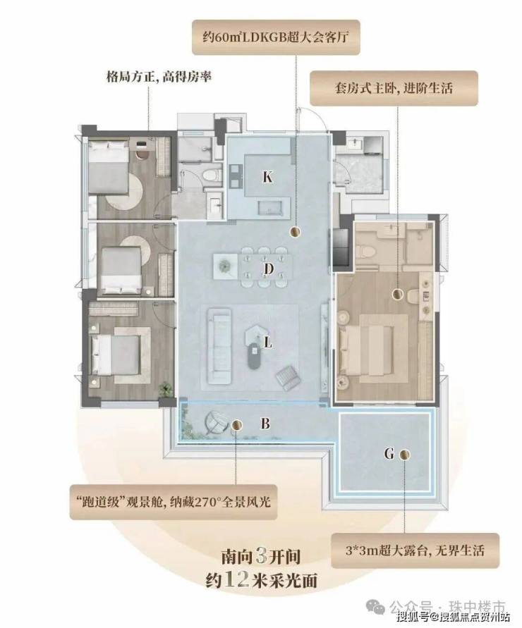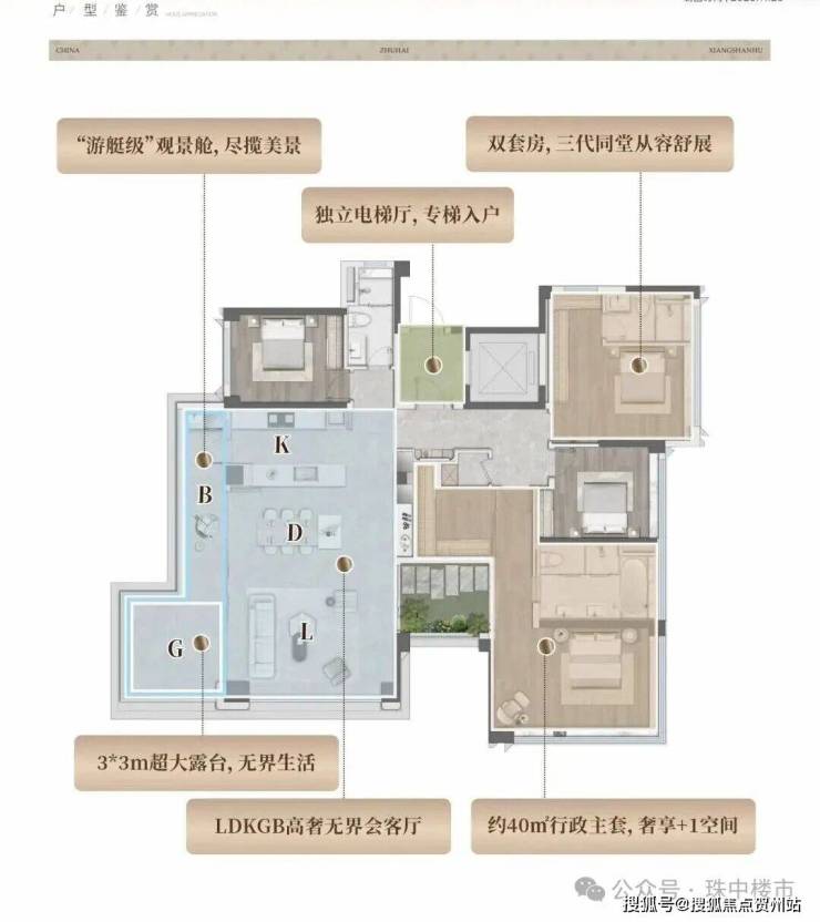 室内,该户型将传统LDKG格局加以升级,让客餐厅、厨房、景观阳台与大露台相连,打造约60㎡家庭活动领地!实现大平层的居住体验。