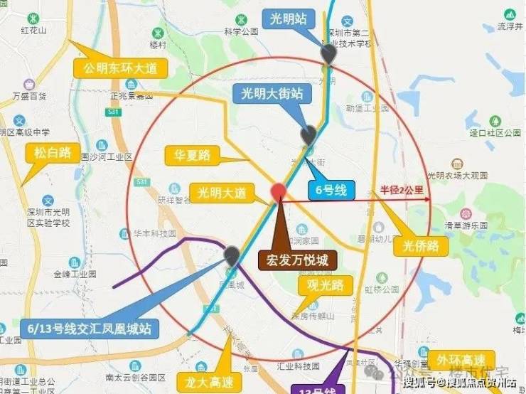 交通:地铁方面:项目地处6号线地铁沿线,刚好为位于凤凰城站和光明大街站两个站点中间位置,步行至两个地铁站都在1公里范围内,但到光明大街站稍近一些,大约是700米。凤凰城站是6和线和在建的13号线的交汇站点,未来可乘坐13号线直达南山深圳湾口岸、人才公园、歌剧院等区域。