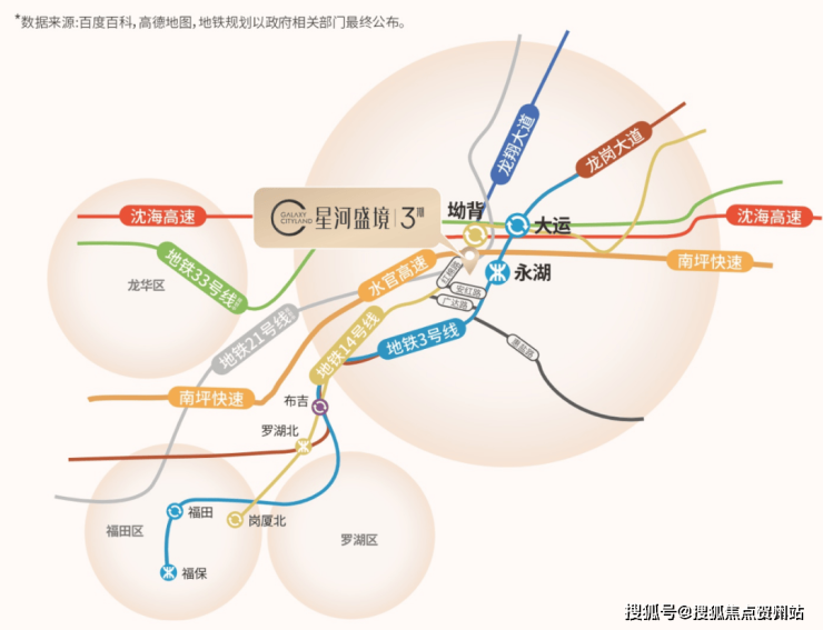 项目靠近地铁3号线永湖站,直线距离一公里范围内还有地铁14号线坳背站,这也是未来地铁21号线的换乘站。