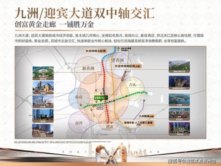 • “海陆空轨”四维一体交通网覆盖,3口岸1桥、5大城际枢纽、5大机场,瞬达湾区各地,通联全国,同频全球;3口岸,咫尺即达拱北/青茂/港珠澳3大口岸,10分钟澳门;粤港澳大湾区超级交通枢纽。1大桥,3km接驳港澳珠澳大桥,通过港珠澳大桥40分钟直达香港。
