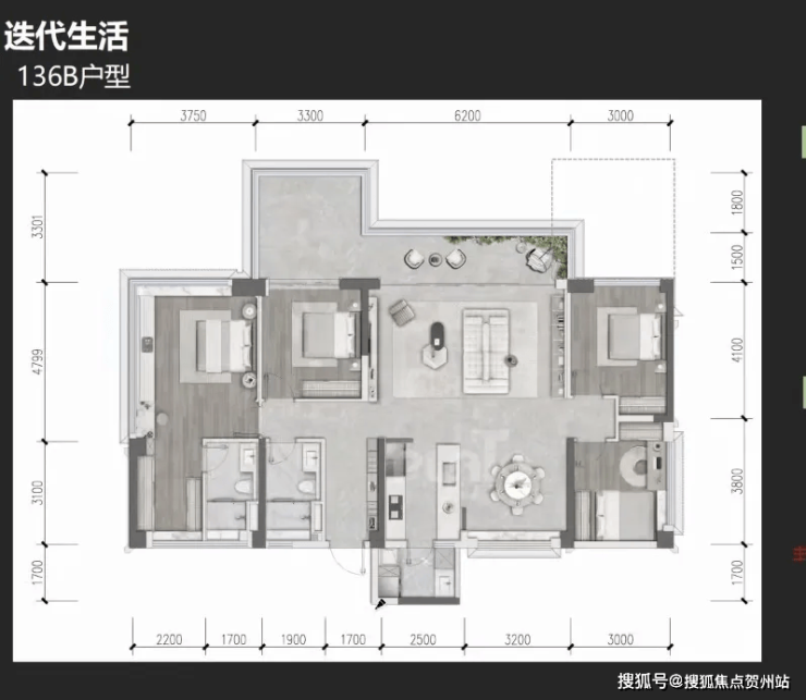 136㎡四房:南向四开间达 16 米,独立缓冲式玄关提升私密性,约 70㎡无界厅境搭配南北呼应的阳台与露台。