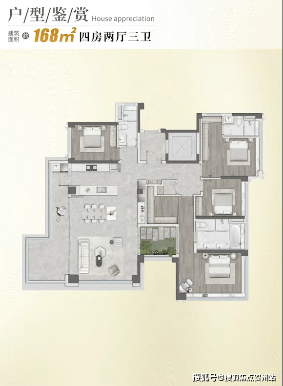 168㎡四房:专梯专户配置,有 3 阳台和双 “全景舱” 设计,行政主卧套房约 40㎡,还配备双台盆与浴缸的阔尺明卫。