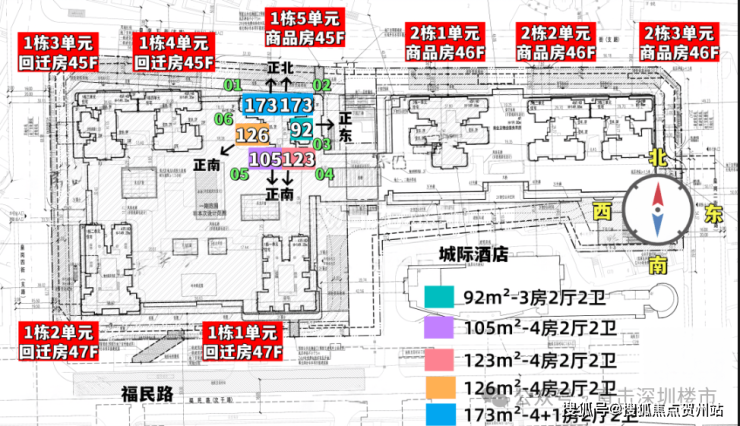 首推一期1栋5单元(45层),91-173㎡3-4房,共232套,以122-175平米4房为主,占比83%,还有两套257平顶复产品。173/257平大户型双电梯独立电梯厅入户,南区91-125平户型3梯4户。