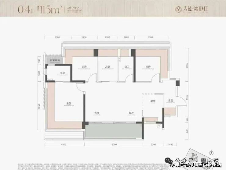 115㎡4房2卫,横厅户型,朝南看海,入户独立玄关,但三个次卧朝北;