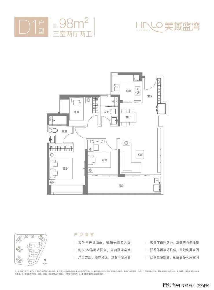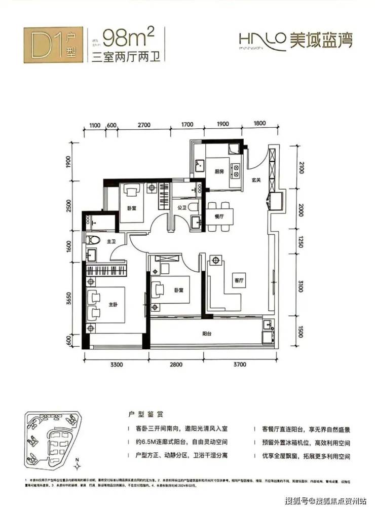 (1)98平方米:竖厅设计,南向面宽7.5米,配备U型厨房。