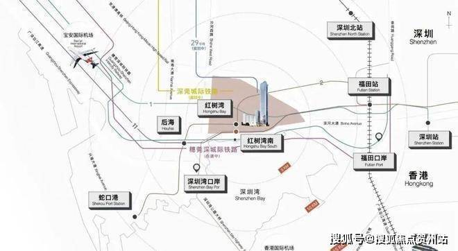 立体枢纽 超速链接湾区生活:6大轨道:2号线红树湾站、9/11/29号线(规划中)红树湾南站、9号线深湾站及穗莞深城际(规划中)、深莞城际(规划中)六轨交汇,畅达湾区城市群