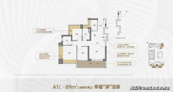竖厅格局,客厅3.5米开间,LDKB一体化,S墙设计预留冰箱卡槽位,客厅连接次卧出5.9米长的大阳台,次卧270°转角飘窗,对比A1户型少一面飘窗,U型厨房,卫生间干湿分离。