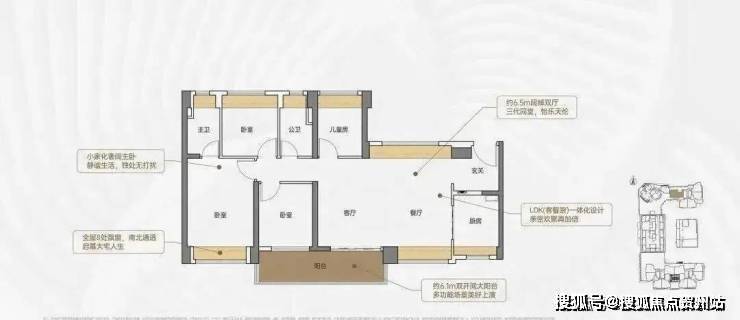 竖厅格局,客厅3.5米开间,LDKB一体化,S墙设计预留冰箱卡槽位,客厅连接次卧出5.9米长的大阳台,主卧双面飘窗,次卧270°转角飘窗,全屋6面飘窗,U型厨房,卫生间干湿分离。