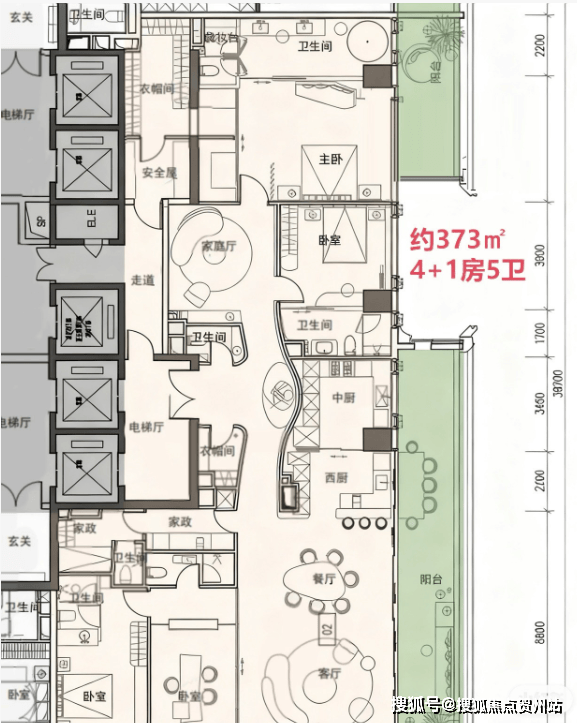 高区42F起(150-200米)是约370-375-403㎡4+1房五卫+家庭厅+家政套间;