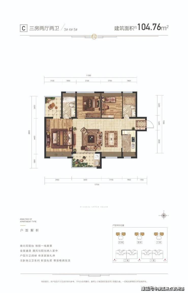 C户型面积:建筑约104㎡3房2厅2卫