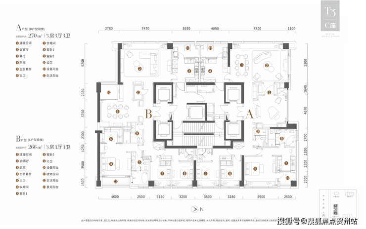 户型示例:T3栋提供266至270平方米的3房2厅户型;