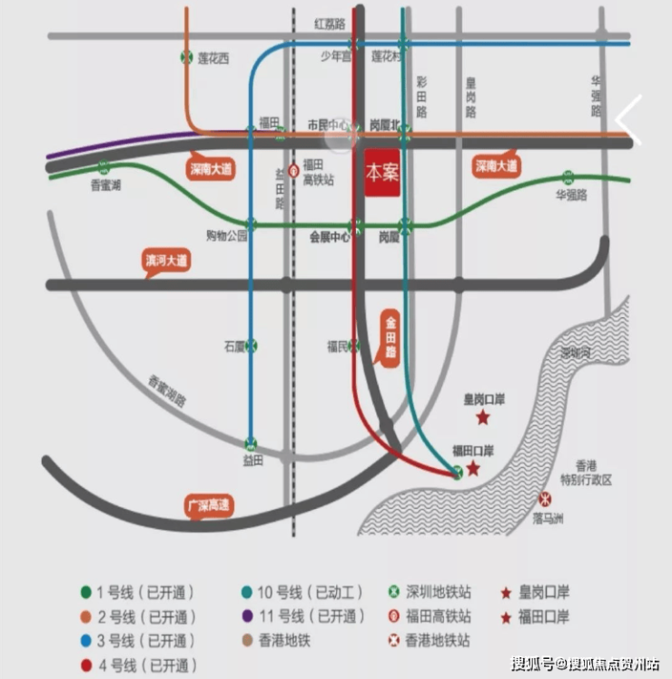 道路网络:紧邻深南大道和滨河大道这两条主要的东西向干道,加上八条地铁线路的覆盖,构成了一个密集且高效的交通网络。