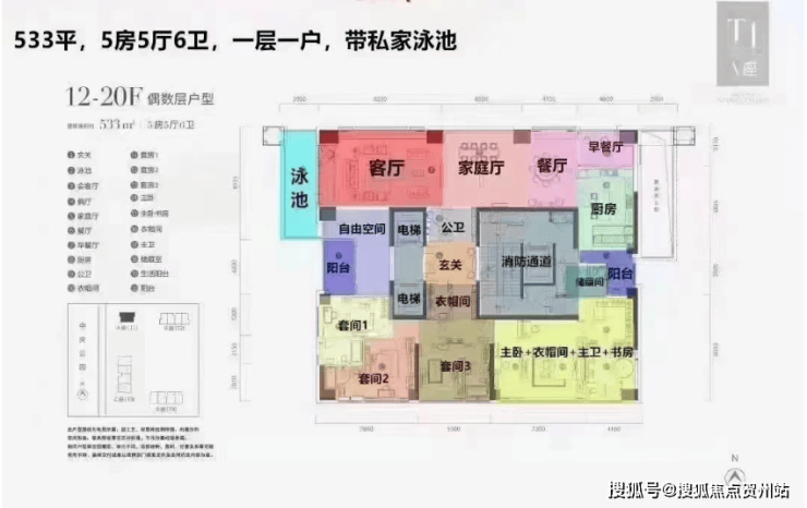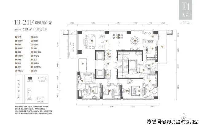 相较之下,T1栋呈现更为奢华的配置,每层仅一户,设有533-540㎡的五房五厅六卫户型和533-538㎡的同类户型,附带私人泳池。总价介于5491-7246万之间。