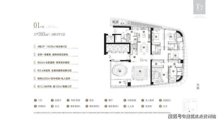 而T7王座总裁公寓中,T7-01户型约393㎡的四房三厅六卫板楼设计,正南朝向,保证良好采光。其特色在于宽敞的约13m客厅开间、近100㎡的L型联厅及约3.6m的高天花板,为居住者提供豪华的生活体验。该户型还特别注重私密性与功能性的设计,如独立的仆人通道和超七星级的主卧套房配置,包括男女独立衣帽间等。