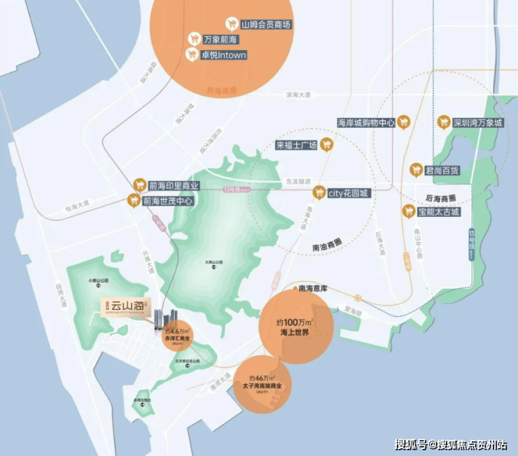 🔘干道环伺:约1.5公里范围内有兴海大道、南海大道、望海路、港湾大道、月亮湾大道等干道,直抵前海、宝中、福田
