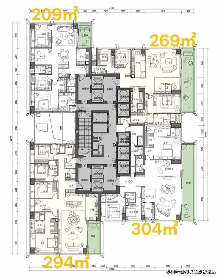 项目首推北区1-2栋共348套房源,户型覆盖209-1100㎡,全部四房三卫起步,彻底告别刚需化设计,保证了圈层的纯粹性。其中,高区58层以上为500-700㎡的顶级大平层,顶楼1100㎡的顶奢大平层仅2套,总价从3000万起,顶楼更是高达4-5亿,单价区间在14-46万/㎡,精准锁定金字塔尖客群。