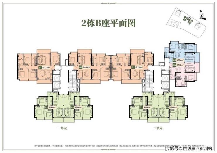 2栋B座二单元04、05户型:面积约为72-74㎡的2房2厅1卫。