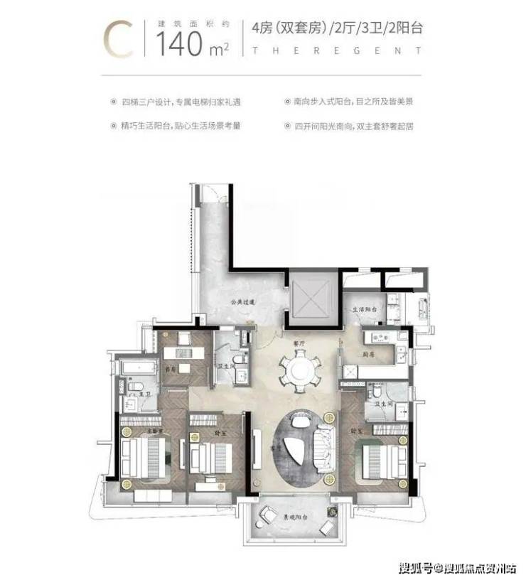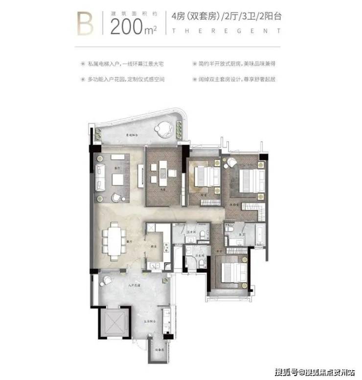 产品亮点:私家电梯入户、约3.4米层高、动静分区南北对流、约6.8米挑空餐客厅、中西双厨、三套房设计、部分房间带阳台设计