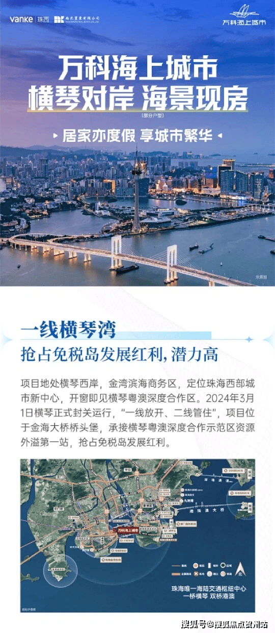 万科海上城市是万科在珠海金湾区滨海商务区打造的一线海景大盘,地处三灶镇丹凤二路 345 号、丹凤四路,金海大桥西侧,三面环海,东侧直面横琴与澳门天际线,景观资源优越,2026 年 1 月处于二期、三期清盘阶段,适合刚需及追求海景的改善型购房者。