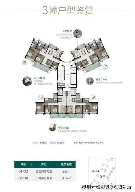 约102-119三房、130-143㎡四房,半山之上户户朝南,全明通透。超阔楼间距,无遮挡视野,至美风光推窗即享。餐客通厅,南北双阳台设计,套房式主卧,U型厨房,卫浴三段式干湿分离等匠心设计,为居者提供美好生活主场