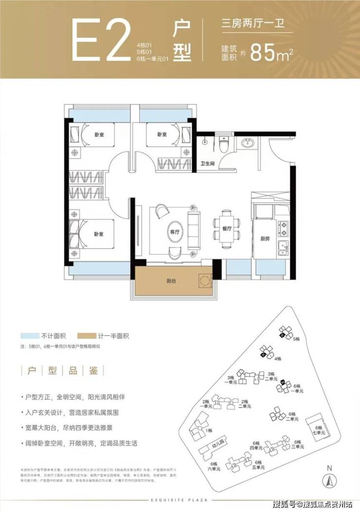 85㎡的3房2厅1卫(E2),得房率:72.95%(不含赠送),阳台主朝东南或西南向看小区园林。