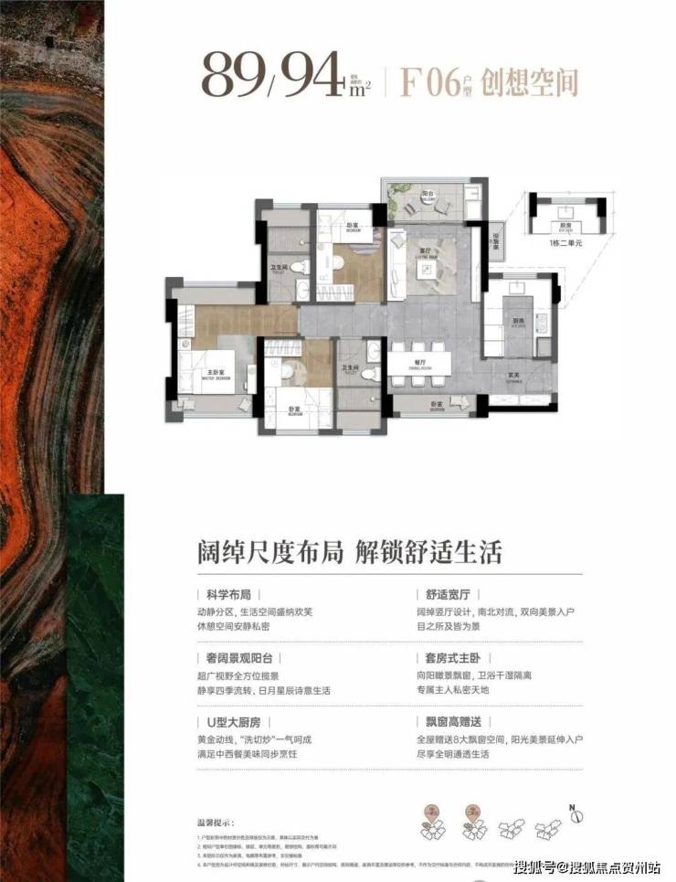89-94平:3房2厅2卫,套内净使用率在80%,东南朝向